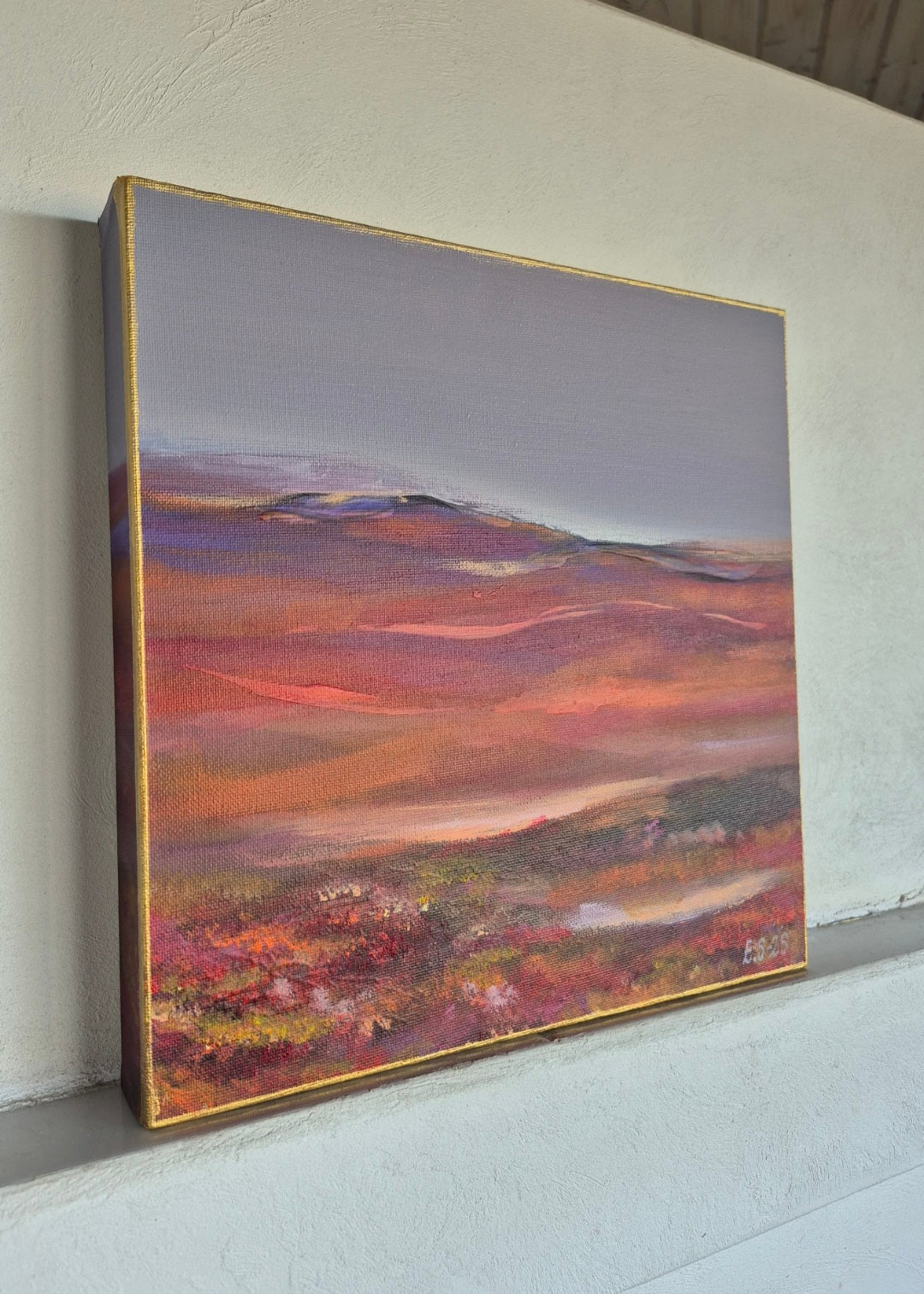 Teos on signeerattu ja ripustusvalmis, takana rautalanka