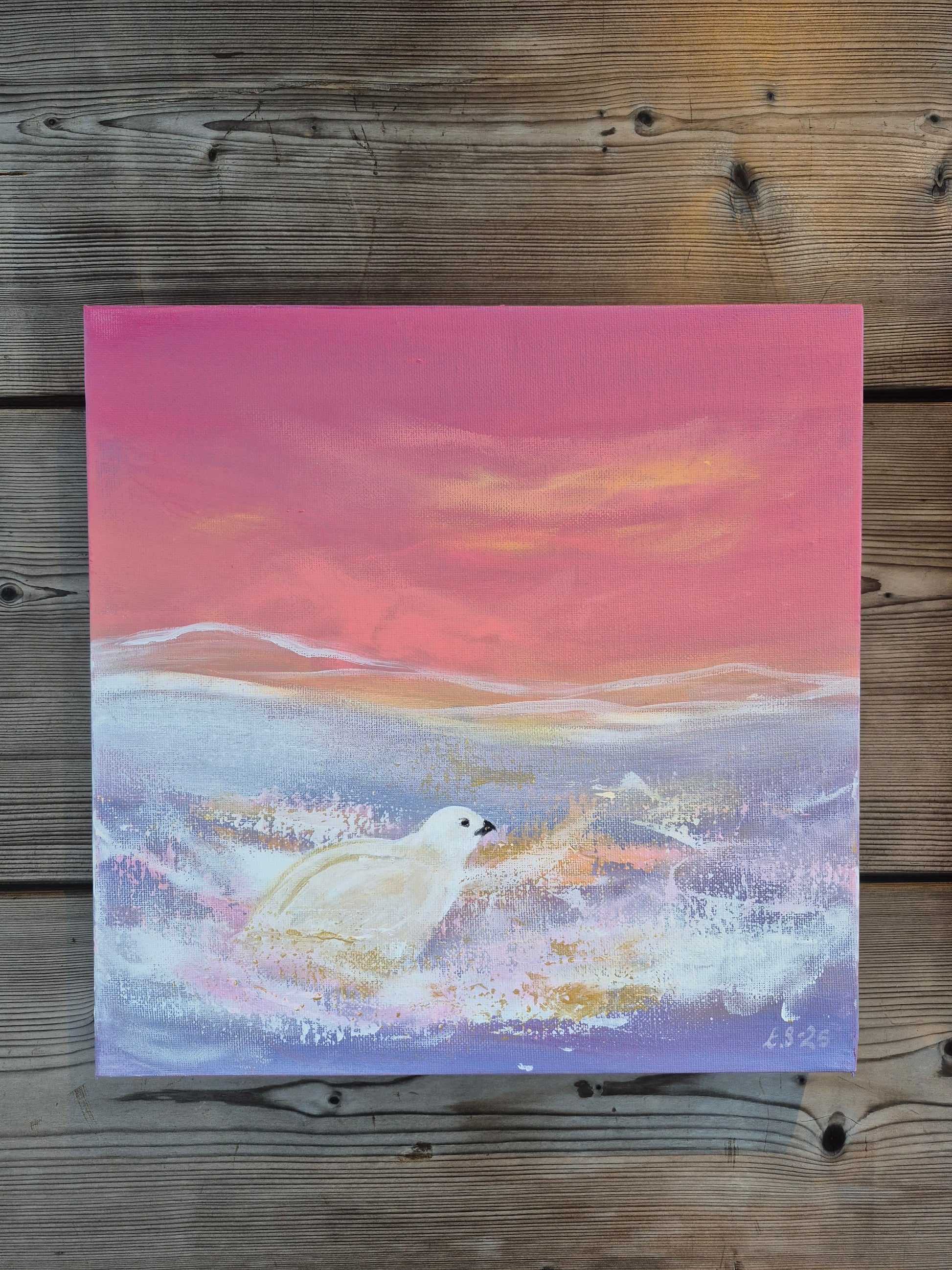 Kaamoksen kauniit, lumoavat sävyt. Riekko kurkottelemassa auringon kultaisiin sävyihin hangillla