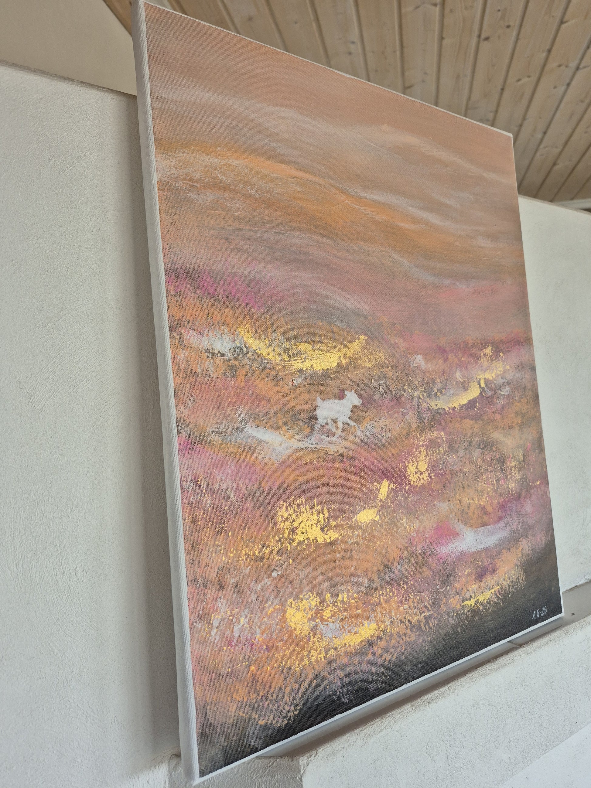 Teos on signeerattu ja ripustusvalmis, takana rautalanka