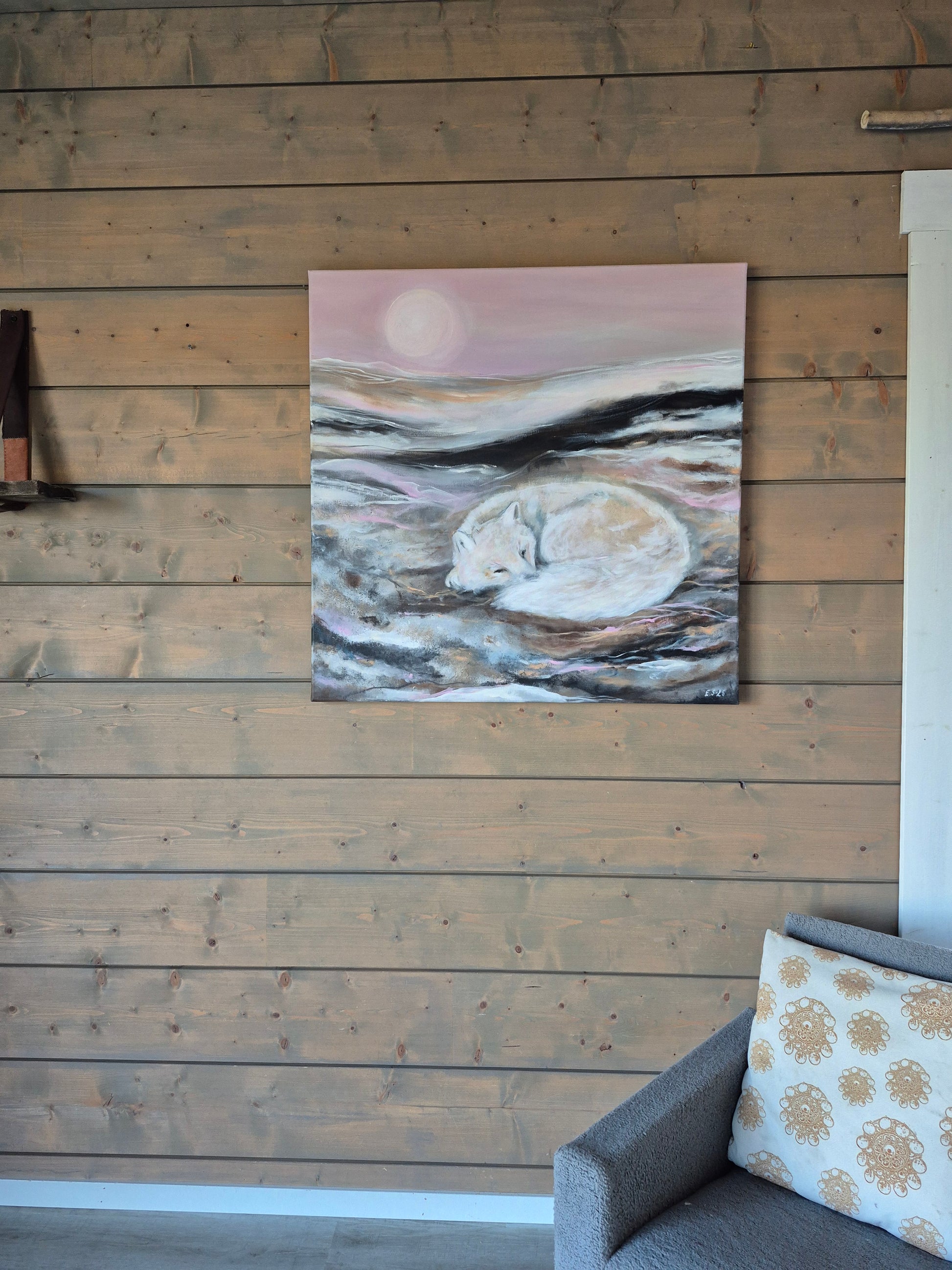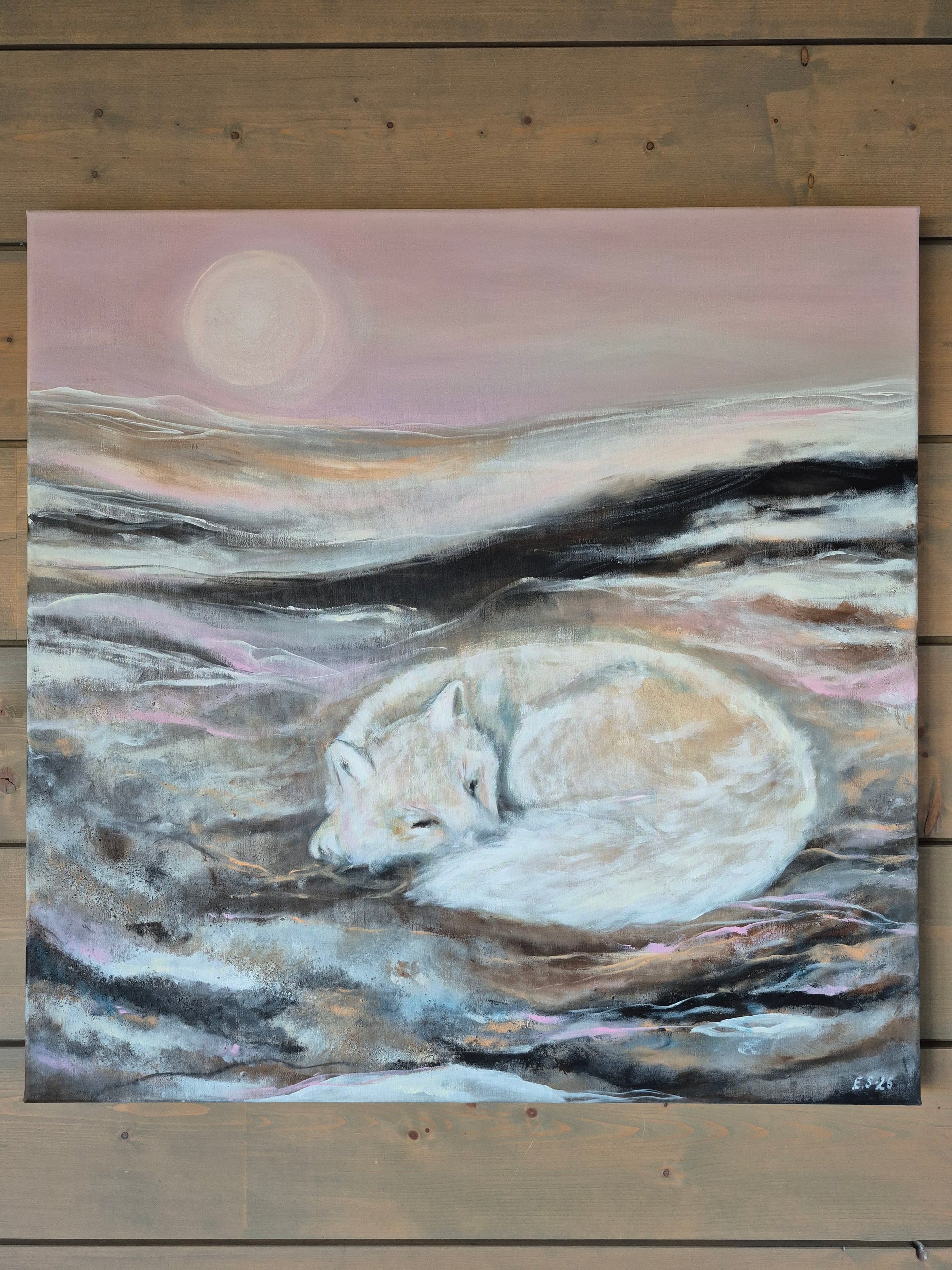 Teos on signeerattu ja ripustusvalmis, takana rautalanka